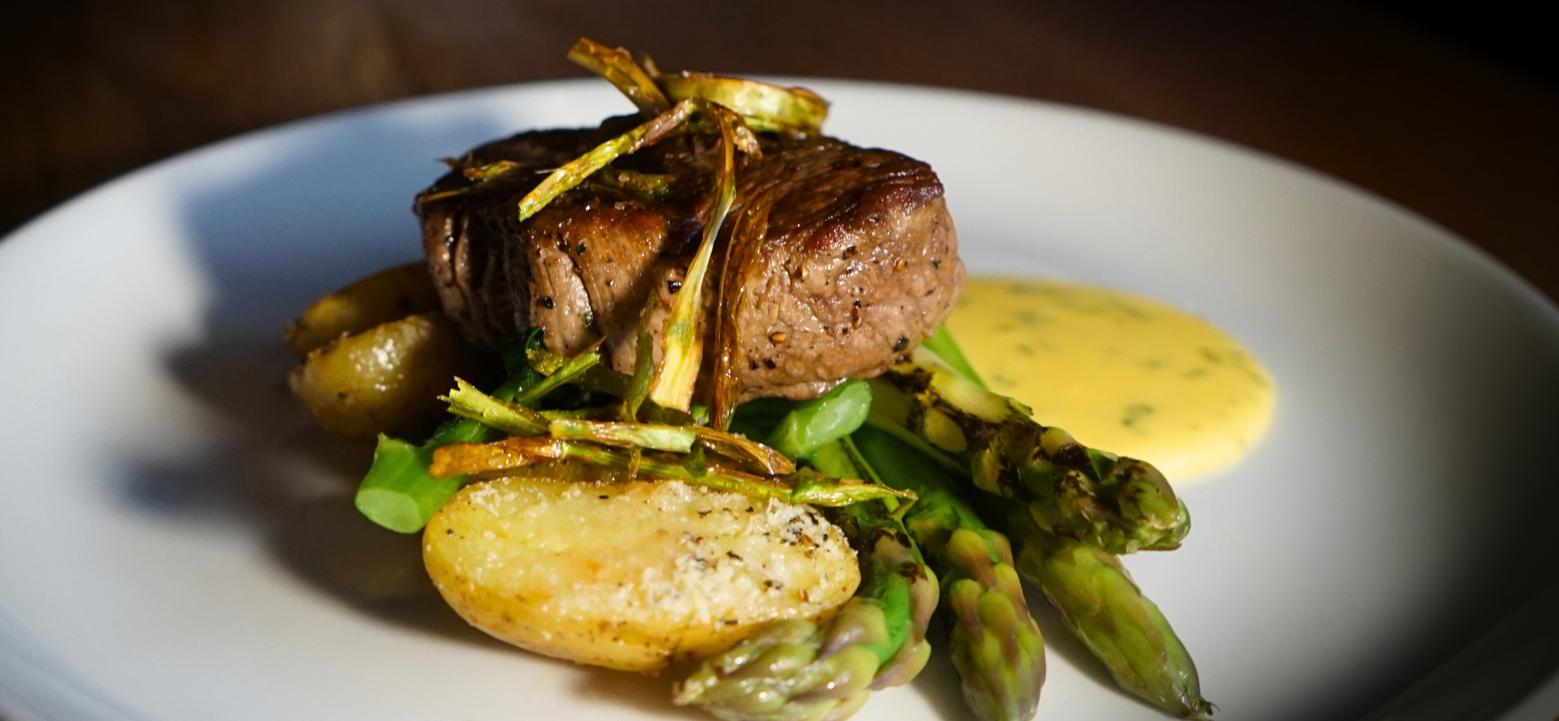 Härän ulkofileepihvi 150g, talon punaviinikastiketta, valkosipuli-pikkuperunoita, pekoniin käärittyä vihreää tankoparsaa, grillitomaattia (L, G)